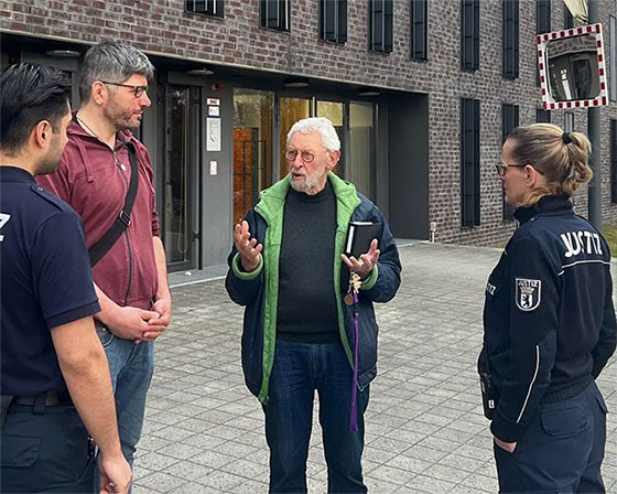 Manfred Lösch mit Diakon Jonas Kessler und zwei Justizbediensteten.